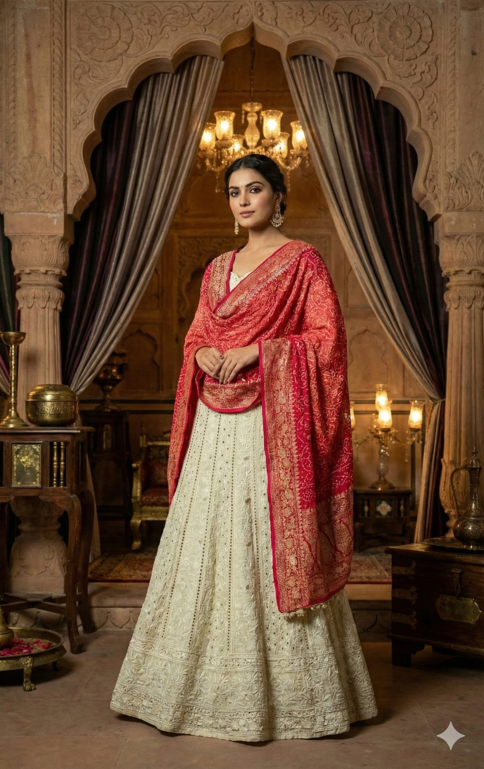 Elegant 2-Taar Chikankari and Mukaish Lehenga with Bandhani Dupatta